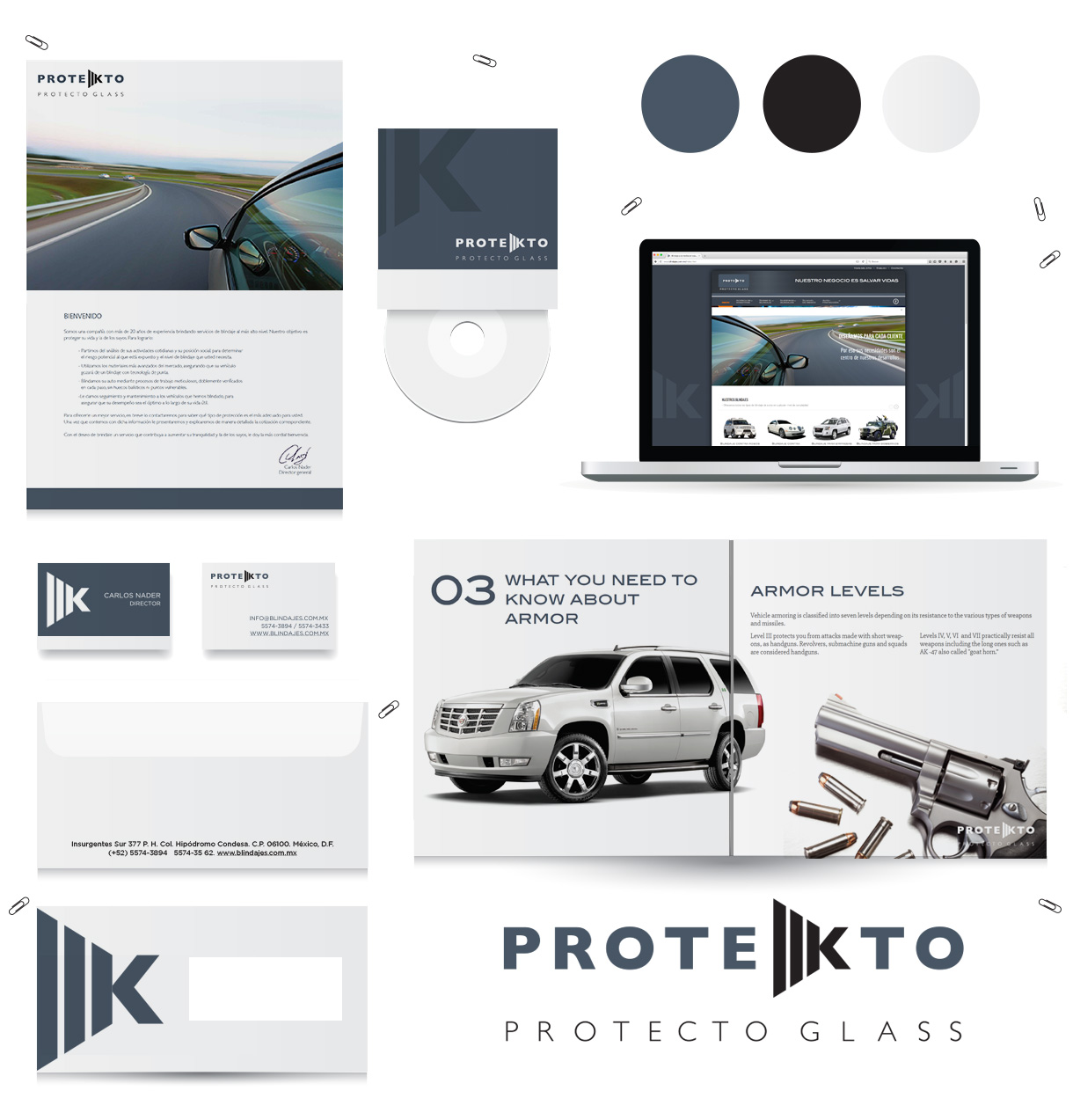 Con base en los principios y valores de la empresa, se desarrolló una nueva imagen que proyectara a Protecto Glass como una institución con el más alto cuidado en vehículos blindados.