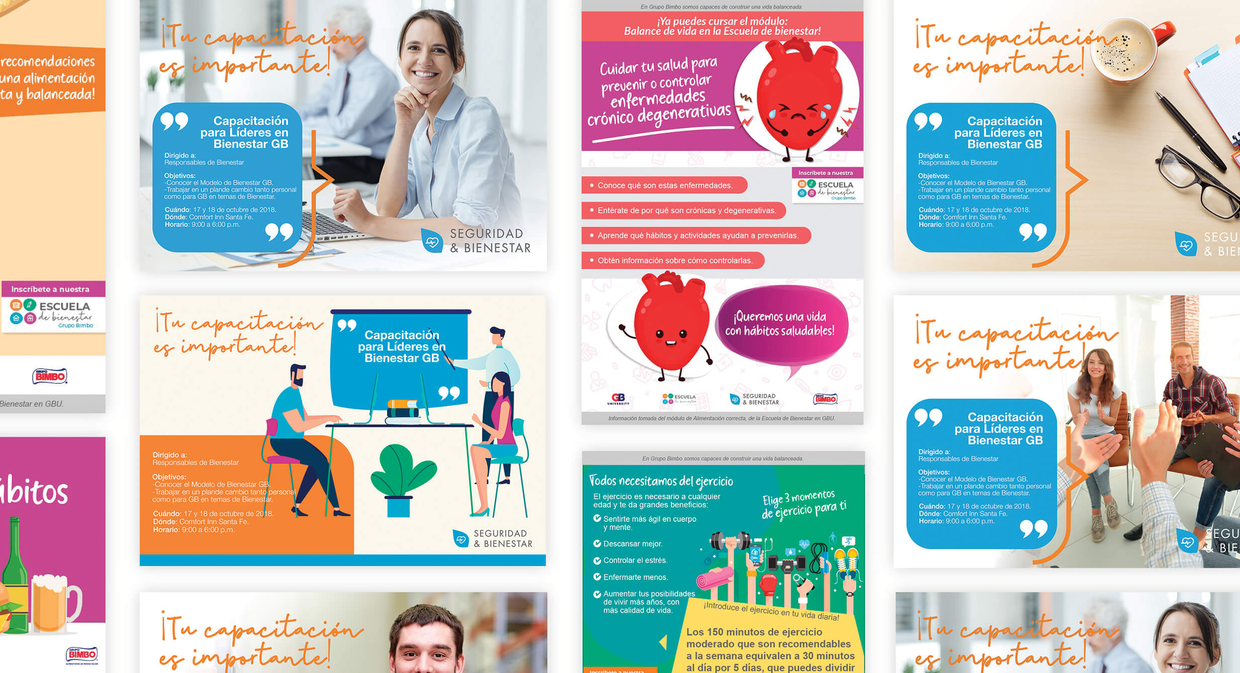 Necesidades: a) crear cursos de capacitación en línea sobre salud y bienestar para su personal en Hispanoamérica, con información relevante, que se pueda incorporar a la vida cotidiana, pero que sean fáciles de entender, montables en su plataforma interna de capacitación; b) creaciones de campañas internas de promoción de los cursos y de reforzamiento de sus contenidos; c) realización de diseño gráfico para diversas presentaciones y materiales sobre salud, seguridad y bienestar.